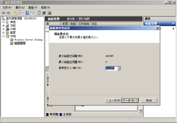 8.根據需要指定卷大小,默認為最大值,單擊“下一步”。