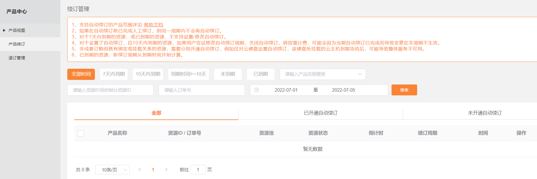 支持續訂操作,登錄官網訂單管理-產品-產品視圖-產品續訂,提交您的續訂需求,續訂規則詳見自動續訂