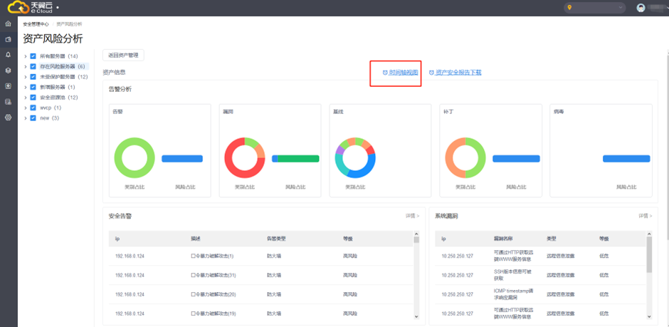 1.在左側選擇需要分析的服務器或服務組,然后點擊【時間軸視圖】,可以進入時間軸視圖進行事件溯源。