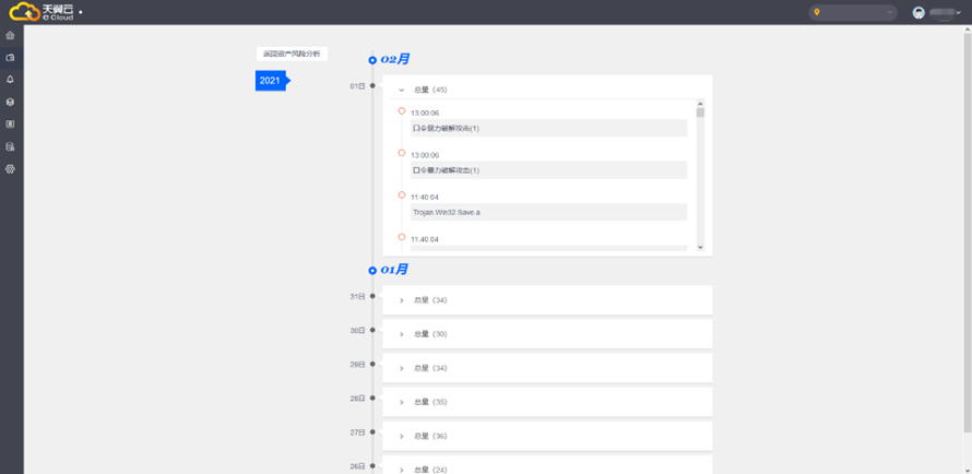 2.跳轉到時間軸頁面,時間軸視圖按發生時間倒敘統計展示資產相關的安全事件,協助管理員從時間角度分析事件發生來龍去脈。