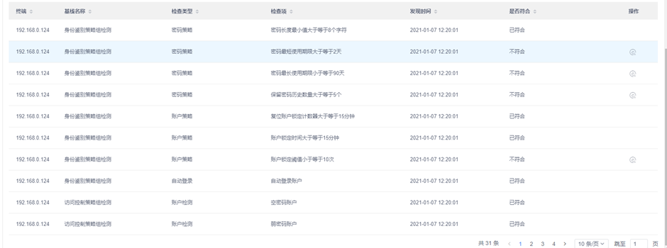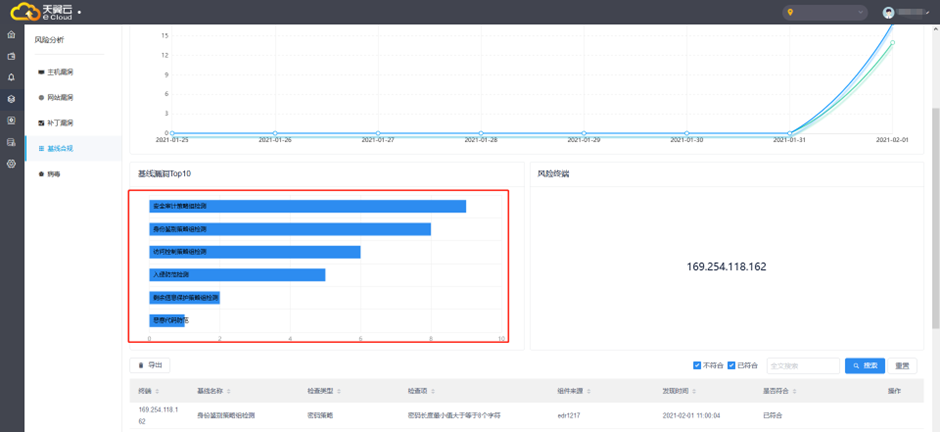 記錄基線合規相關風險信息,其中包括終端IP地址、基線名稱、基線檢查類型、發現時間及是否修改符合。