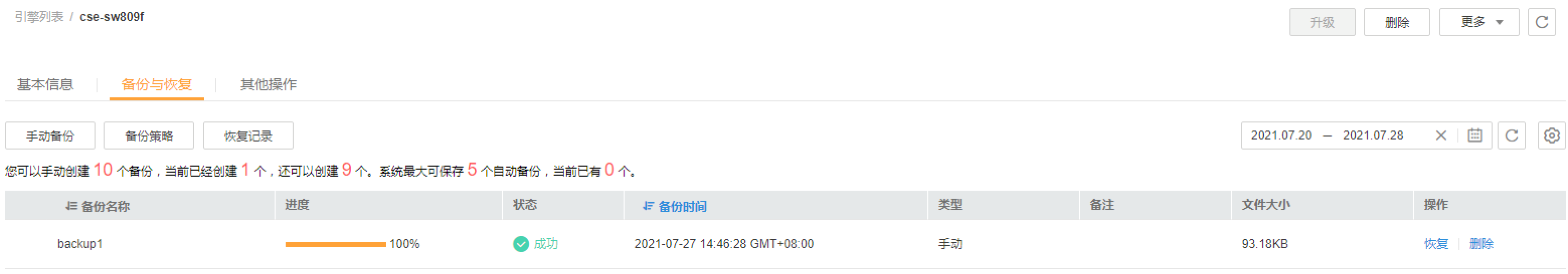 用戶可自定義備份策略,對狀態為“可用”的微服務引擎進行定期備份,也支持手動對微服務引擎進行備份。