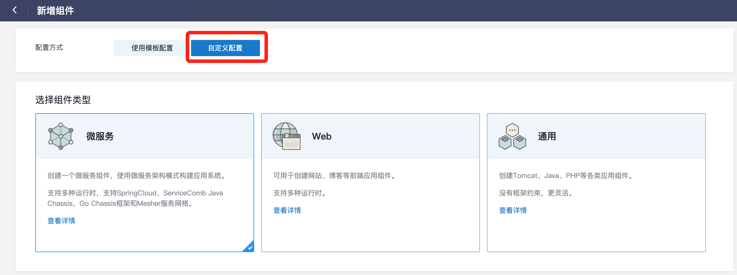 3、“配置方式”選擇“自定義配置”,“選擇組件類型”選擇“微服務”,單擊“下一步”。