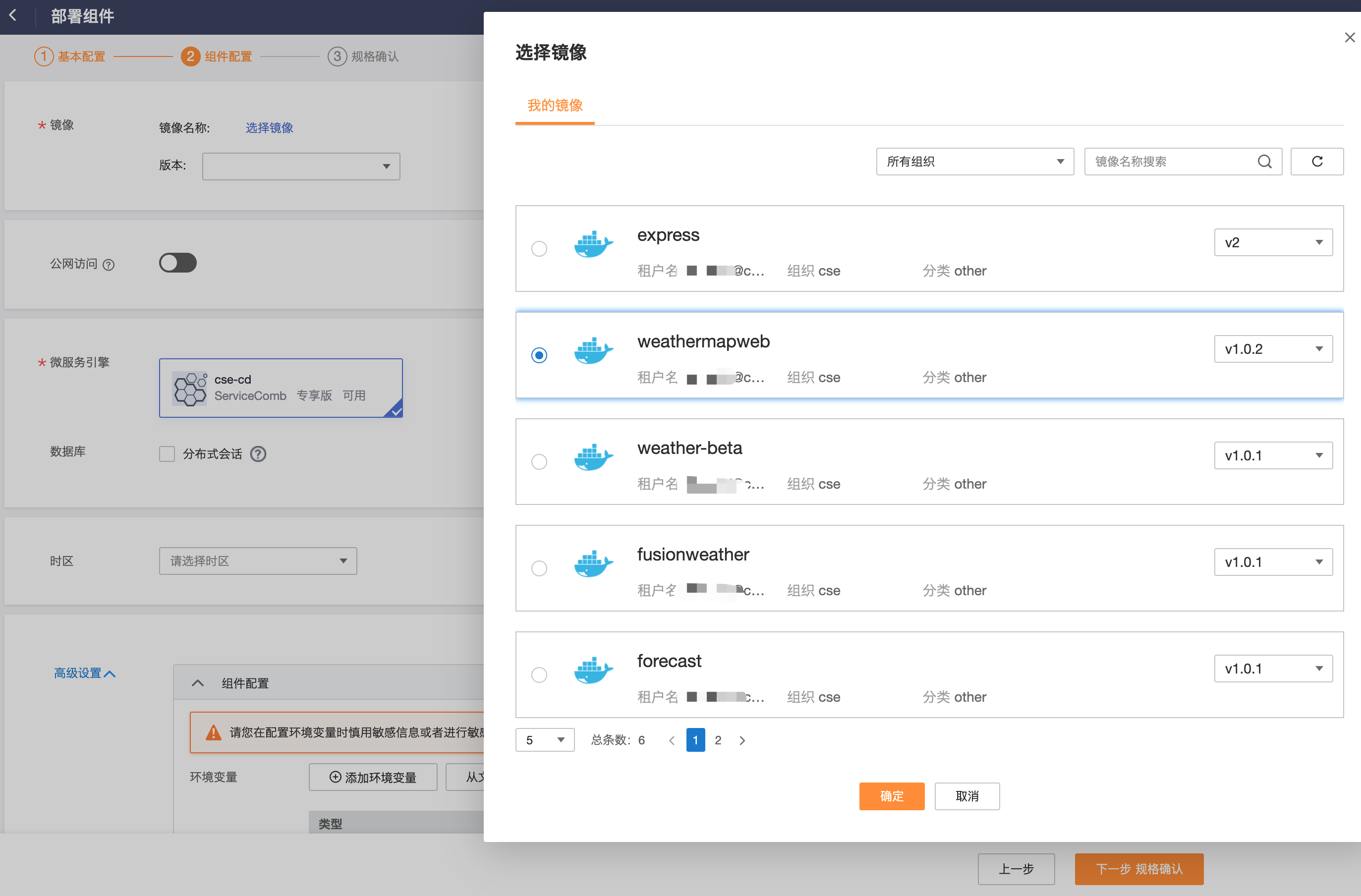 - “鏡像”:單擊“選擇鏡像”,在“我的鏡像”頁簽搜索“weathermapweb”,選擇創建組織創建的組織名稱下的weathermapweb鏡像包及其版本號,單擊“確定”。