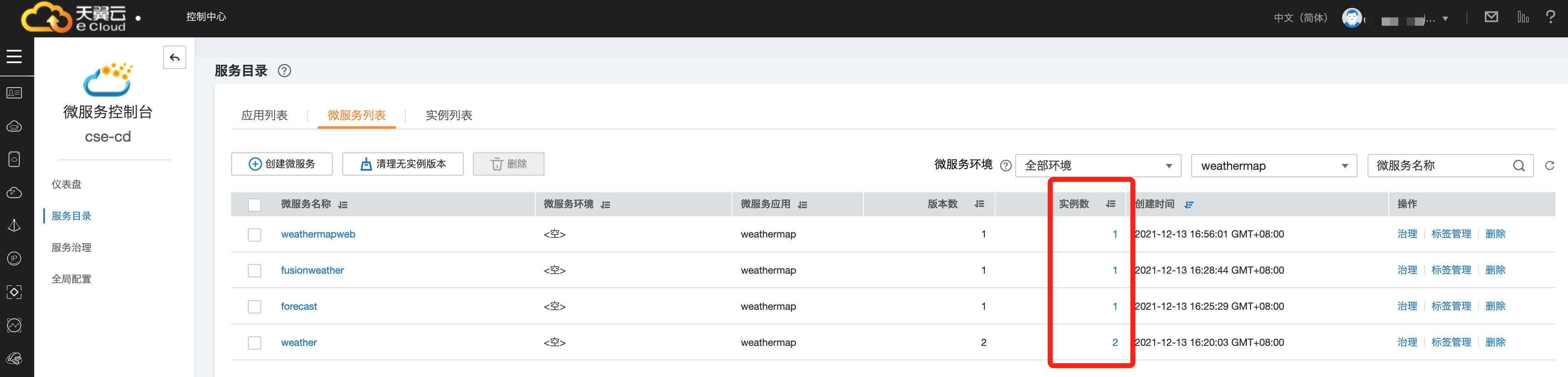 3、選擇“服務目錄 > 微服務列表”,在“全部應用”下拉列表中選擇創建應用時創建的應用名稱(例如weathermap)。