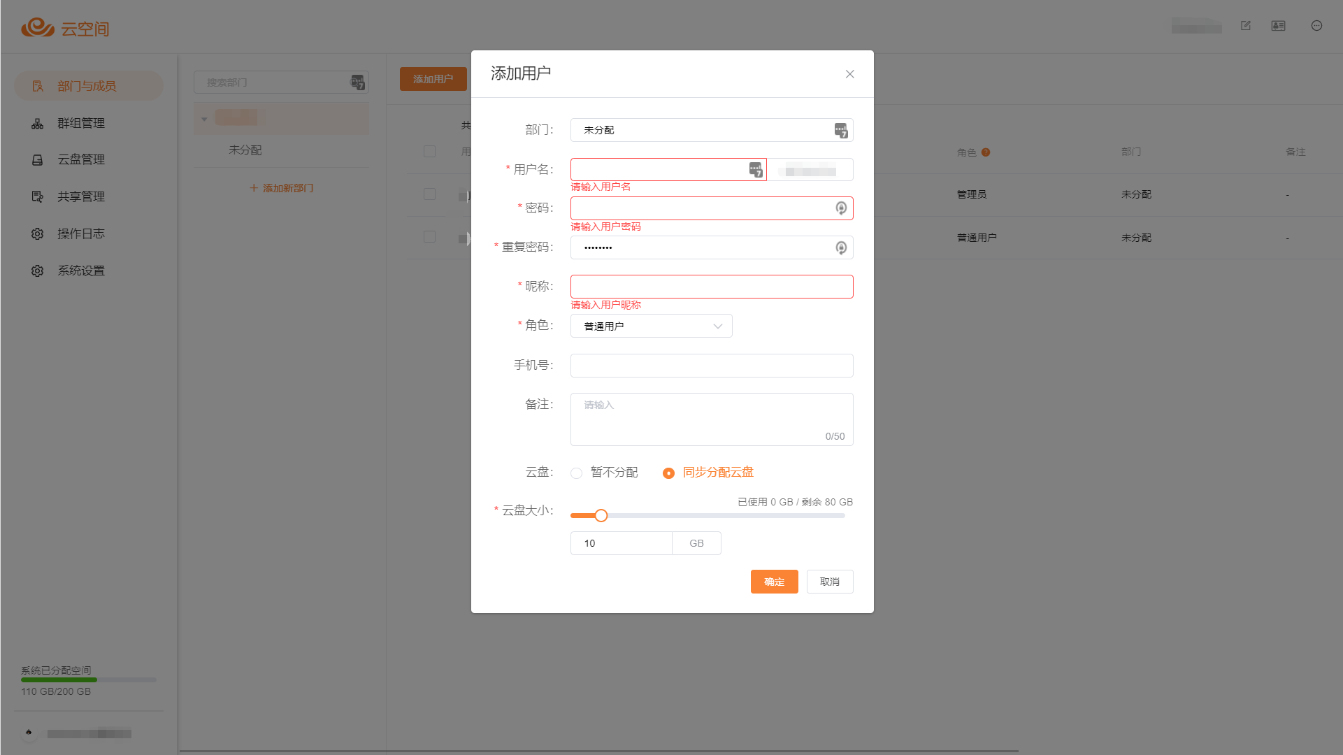 在Web BasicUI的【用戶管理頁】中,點擊【添加用戶】,在彈框中輸入用戶名、密碼、昵稱,選擇普通用戶角色或者管理員角色,同步分配云盤并設置云盤大小,點擊【確定】即可為空間添加用戶賬號。添加完成后,用戶名被設置為“用戶名@空間名”。