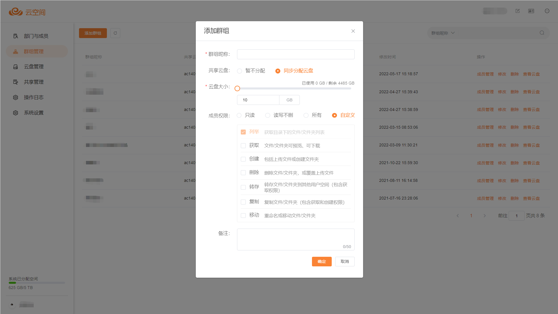 添加群組時若選擇同步分配共享云盤,則可以進一步設置云盤大小以及群組成員對于該群組共享空間內文件的操作權限。