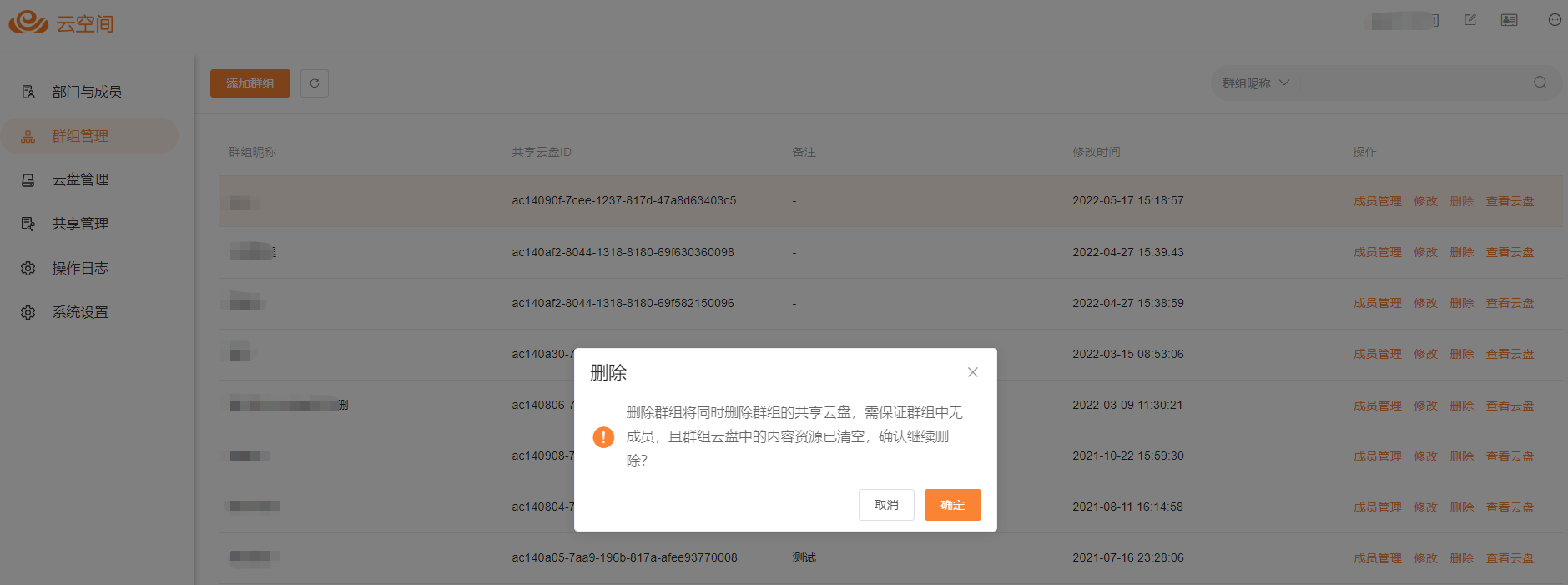 當管理員需要刪除群組時,首先進入群組管理界面,可通過按照群組名稱搜索到待刪除的群組,然后點擊右側【刪除】按鈕進行刪除。需注意的是,刪除群組將同時刪除群組的共享云盤,因此需保證群組中無成員,且群組共享云盤中的內容已清空,否則無法刪除群組。