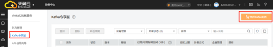 步驟二:進入專屬云節點后,在控制臺中的產品列表中選擇“分布式消息服務”,進入到服務控制臺,在左側菜單欄選擇“Kafka專享版”,進入Kafka專享版實例列表頁面。