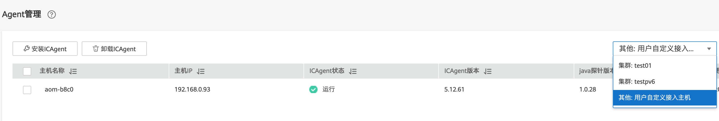 步驟 2 進入Agent管理頁面,在右側下拉框選擇目標主機的集群或“其它:用戶自定義接入主機”。