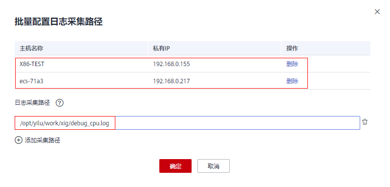 在列表中選中一個或多個虛機前的復選框,單擊“批量配置”,在“日志采集路徑”文本框中輸入指定的日志目錄或文件,例如/opt/user/work/xig/debug_cpu.log。如需配置多條不同的路徑,單擊“添加采集路徑”。