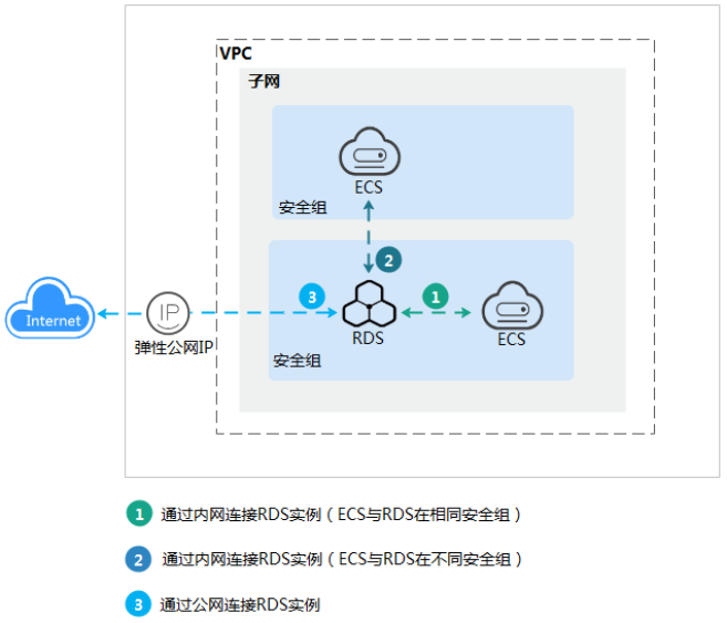 公網連接 | 彈性公網IP | 不能通過內網IP地址訪問RDS實例時,使用公網訪問,建議單獨綁定彈性公網IP連接彈性云服務器(或公網主機)與關系型數據庫實例。 | 降低安全性。
