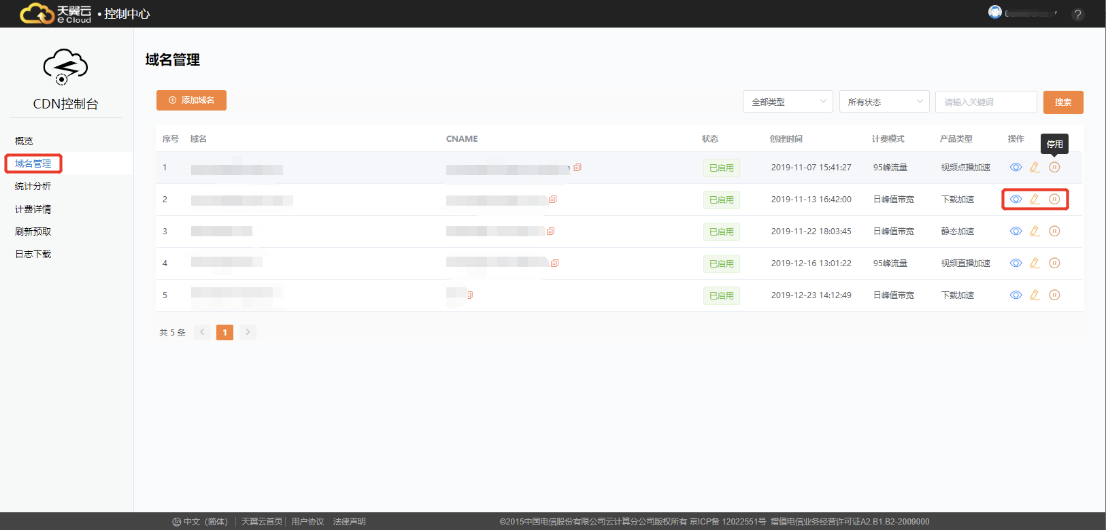 客戶也可以根據需求,進入客戶控制臺(//cdn.daliqc.cn/h5/ctbrm)的“域名管理”頁面,操作域名“停用”以及“啟用”等操作。