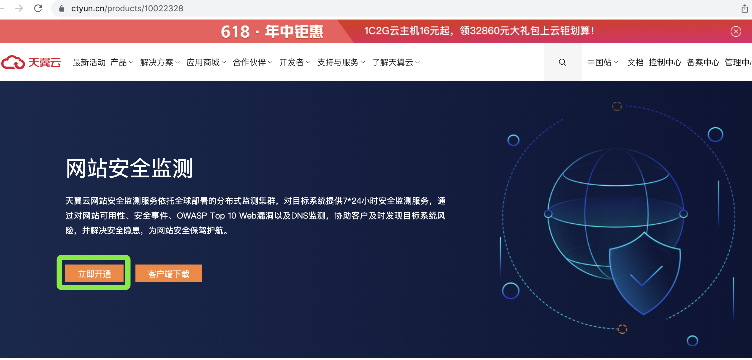 開通天翼云網站安全監測服務,須注冊天翼云賬戶并確保已實名認證。