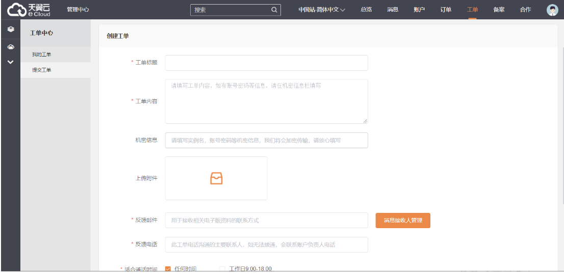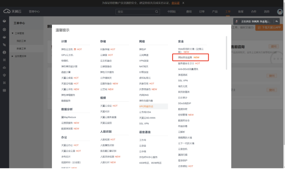 【步驟一】登陸天翼云官網,點擊用戶菜單下的“工單管理“。