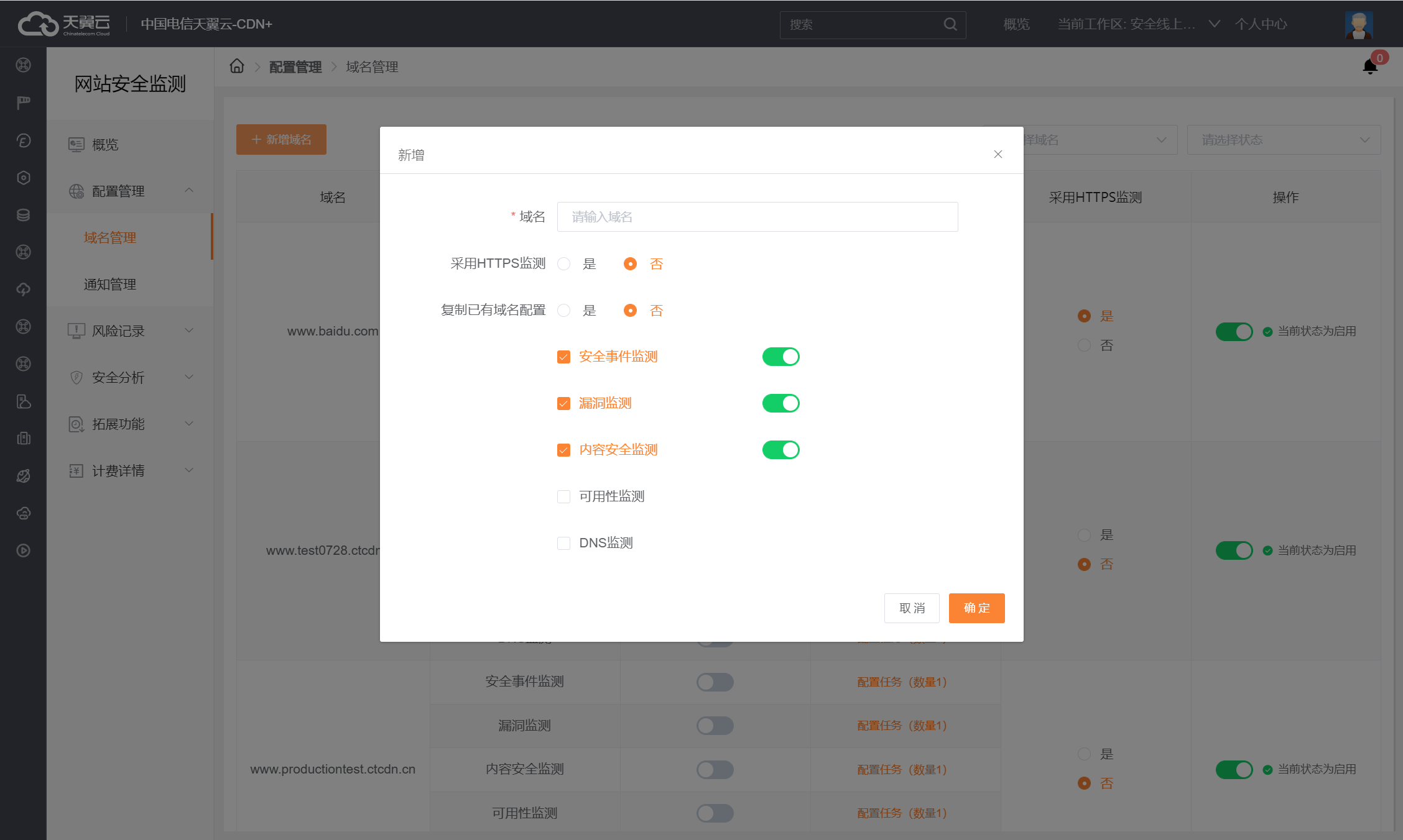 點擊【+新增域名】,彈出新增域名表單,填寫域名新增信息。根據頁面的引導填寫域名、是否采用HTTPS監測、是否復制已有域名配置、若非復制已有域名配置則需要選擇開啟的子功能項(安全事件監測、漏洞監測、內容安全監測、可用性監測和DNS監測),選項填畢后點擊確定即可完成域名的新增。