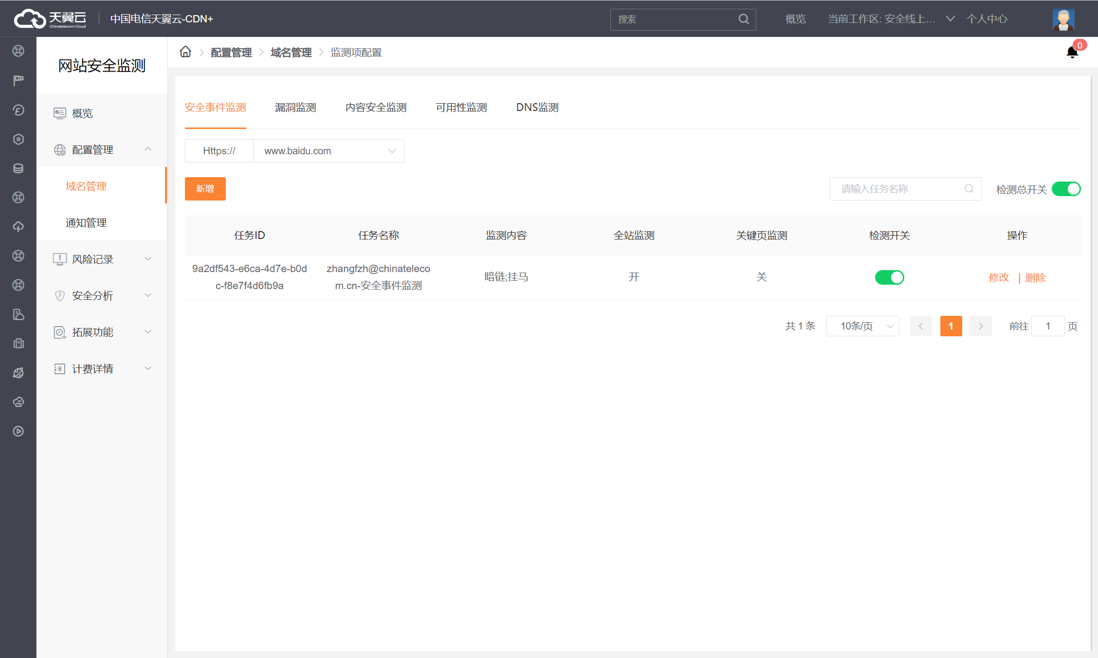 在域名添加完成后,可以按需配置監測項,您可以在某一域名的配置頁面下切換不同的監測子功能,并在子功能頁面內配置任務。