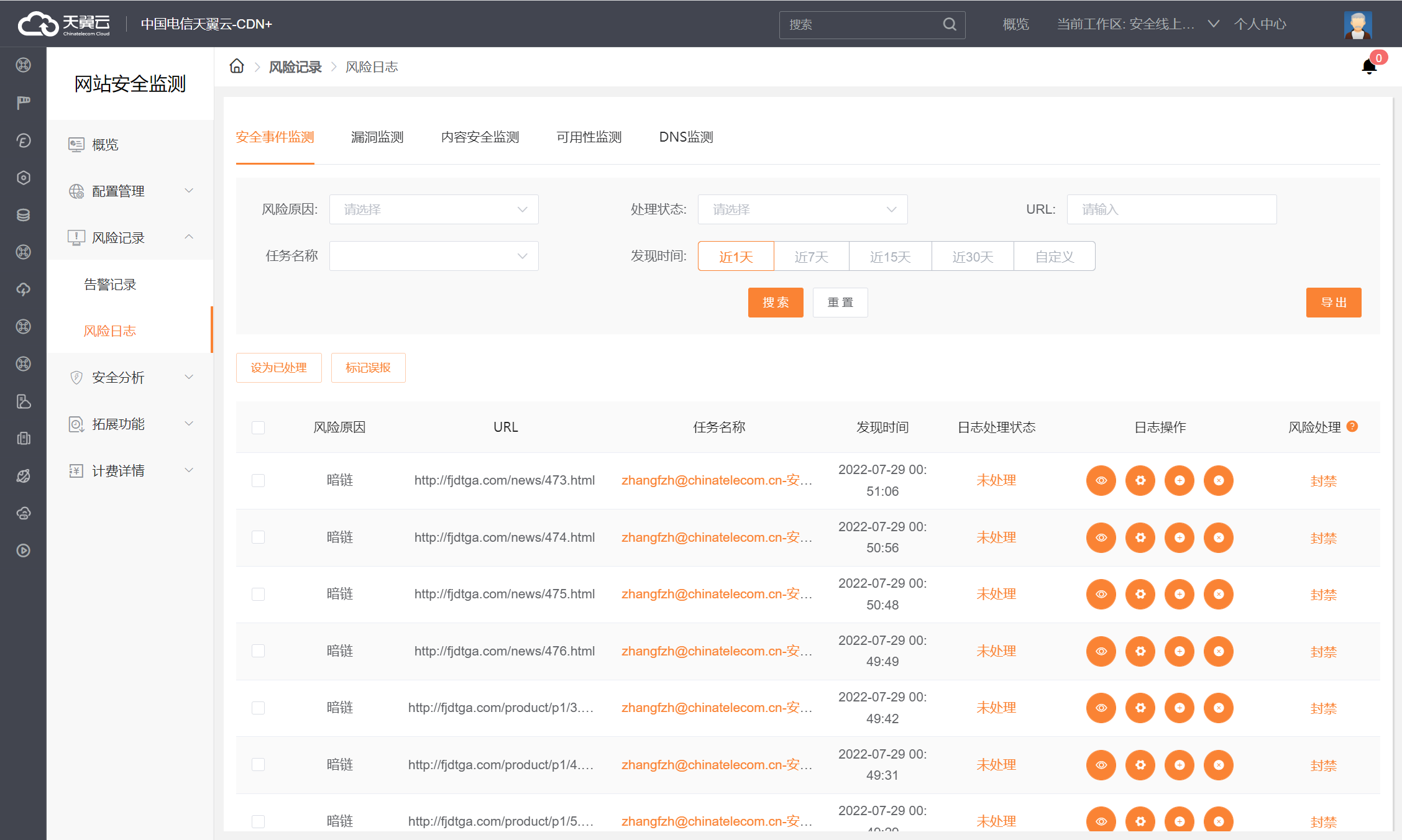 可通過篩選項進行組合查詢,篩選項包括風險原因、處理狀態、URL和發現時間等,若沒有選擇條件則顯示所有風險列表;