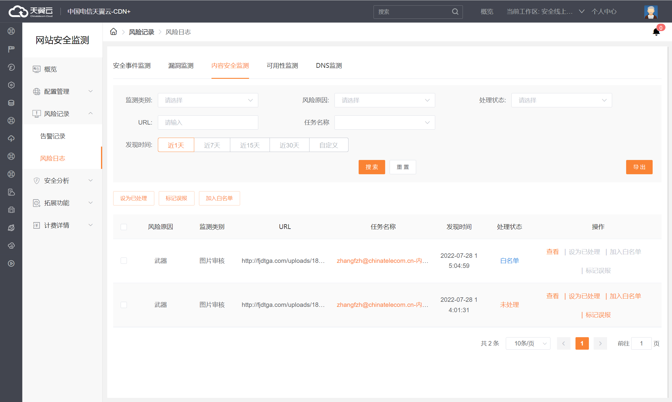 可通過篩選項進行組合查詢,篩選項包括監測類別、風險原因、處理狀態、URL和發現時間等,若沒有選擇條件則顯示所有風險列表;