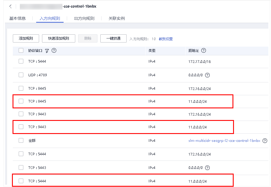 已有集群添加節點時,如果子網對應的VPC新增了擴展網段且子網是擴展網段,要在控制節點安全組(即集群名稱-cce-control-隨機數)中添加如下三條安全組規則,以保證集群添加的節點功能可用(新建集群時如果VPC已經新增了擴展網段則不涉及此場景):