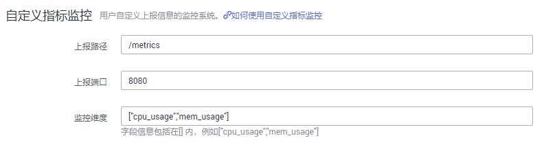 ,并在您的工作負載中提供獲取自定義指標數據的GET接口,以便能夠通過該接口獲取您的自定義指標數據。 說明: 當前僅支持獲取prometheus的。 步驟 1 當您在創建工作負載時,在“高級設置”步驟中配置“自定義指標監控”。 步驟 2 您的exporter必須提供自定義指標的上報端口及上報路徑,請參考下圖設置。設置完成后,CCE將通過“//PodIP:上報端口/上報路徑”GET請求(例如,//192.168.1.19:8080/metrics)獲取自定義指標數據。 設置自定義指標監控 表-參數說明 參數 說明 是否必須設置 上報路徑 exporter提供的供CCE獲取自定義指標數據的URL。 由字母、數字、斜杠(/)和下劃線(_)組成,且必須以“/”開頭。例如,/metrics。 是 上報端口 exporter提供的供CCE獲取自定義指標數據的端口。 取值范圍:1~65535。例如,8080。 是 監控維度 exporter提供的自定義指標名稱。 自定義指標名稱為由字母、數字和下劃線(_)組成的字符串,長度為5~100個字符。輸入格式為:["自定義指標名稱1","自定義指標名稱2"],多個自定義指標名稱請以英文逗號(,)分隔。例如,["cpu_usage","mem_usage"]。 否