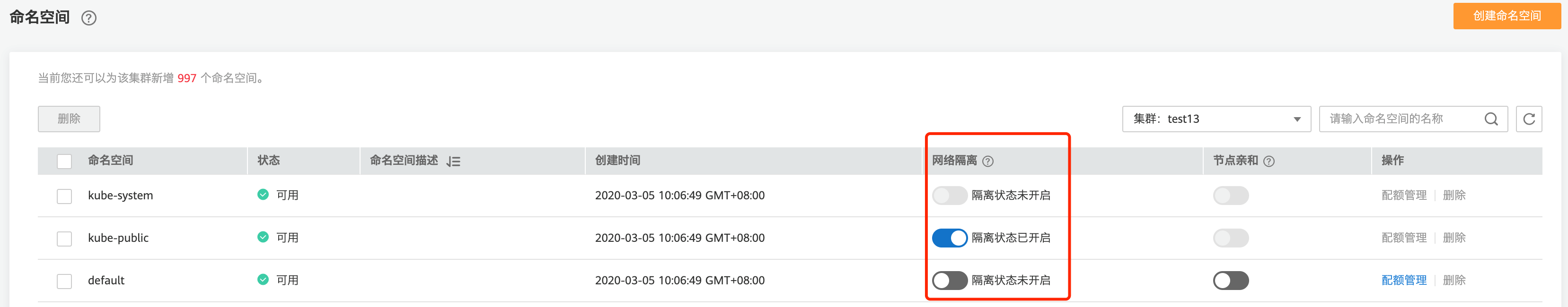 您可以通過網絡隔離開關,設置命名空間層面的網絡策略。