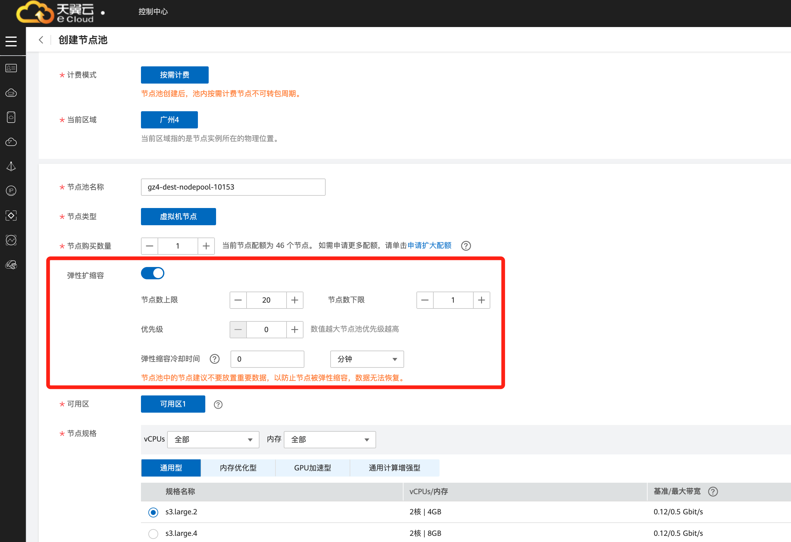 在CCE控制臺中,創建一個節點池,添加一個2U4G的節點,并打開節點池的彈性擴縮容開關,如下圖所示。