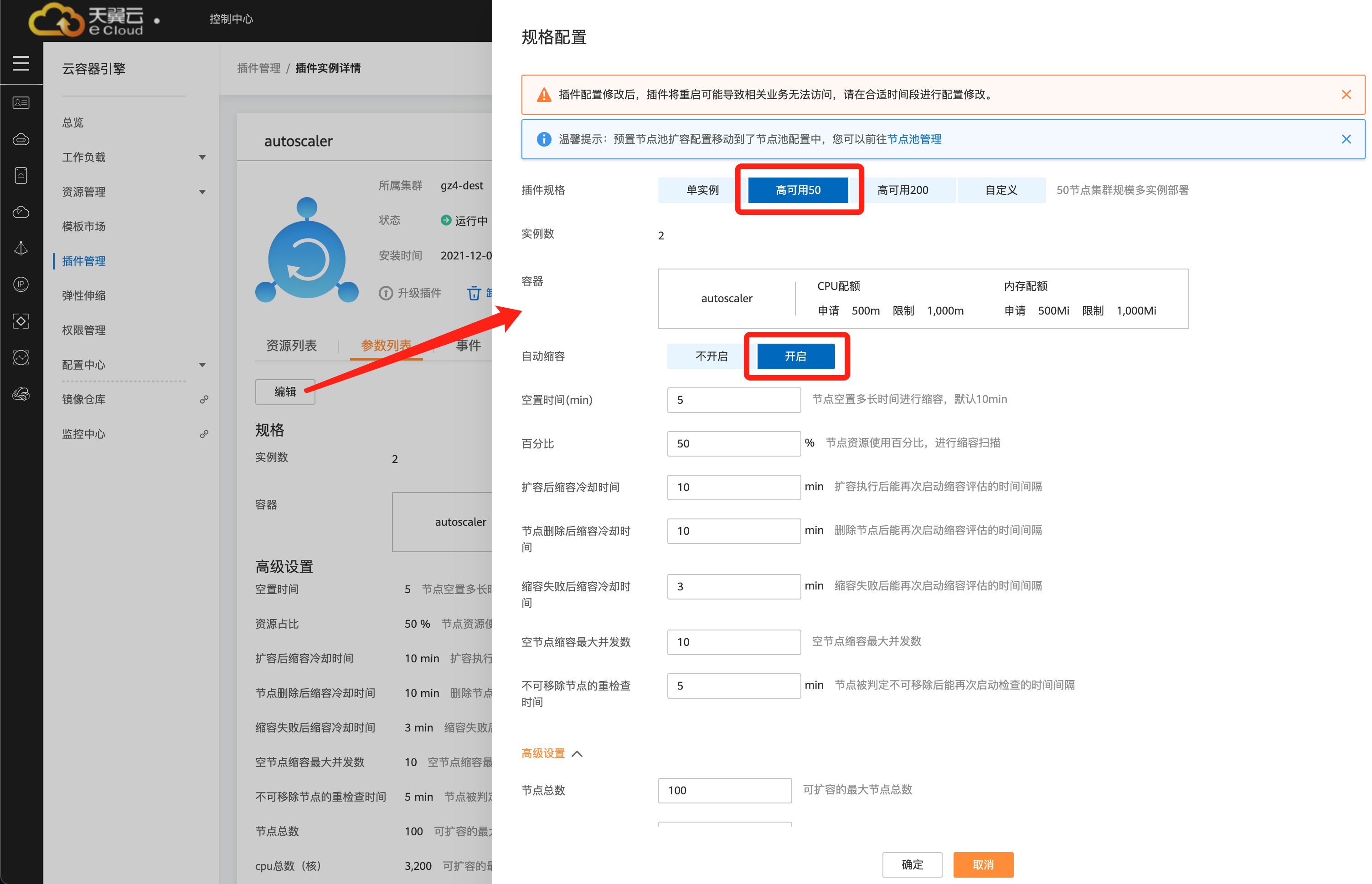 修改autoscaler插件配置,將自動縮容開關打開,并配置縮容相關參數,例如節點資源使用率小于50%時進行縮容掃描,啟動縮容。插件規格建議至少選擇“高可用50”,即保證運行不少于2個autoscaler實例。