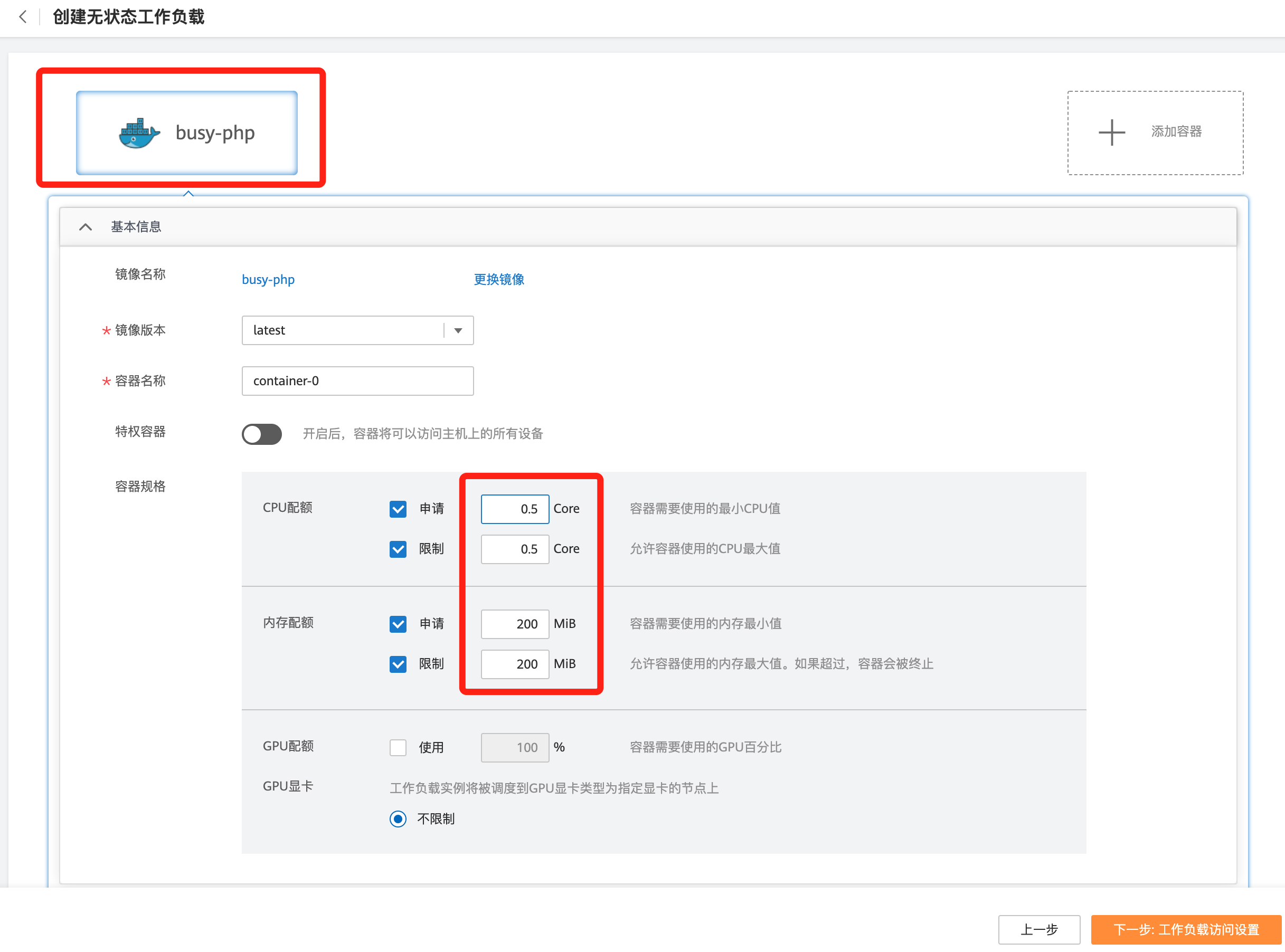 使用剛構建的busy-php容器鏡像創建無狀態工作負載,副本數為1。vCPU設置為0.5 core、內存設置為200MiB,limits與requests建議取值保持一致,避免擴縮容過程中出現震蕩。