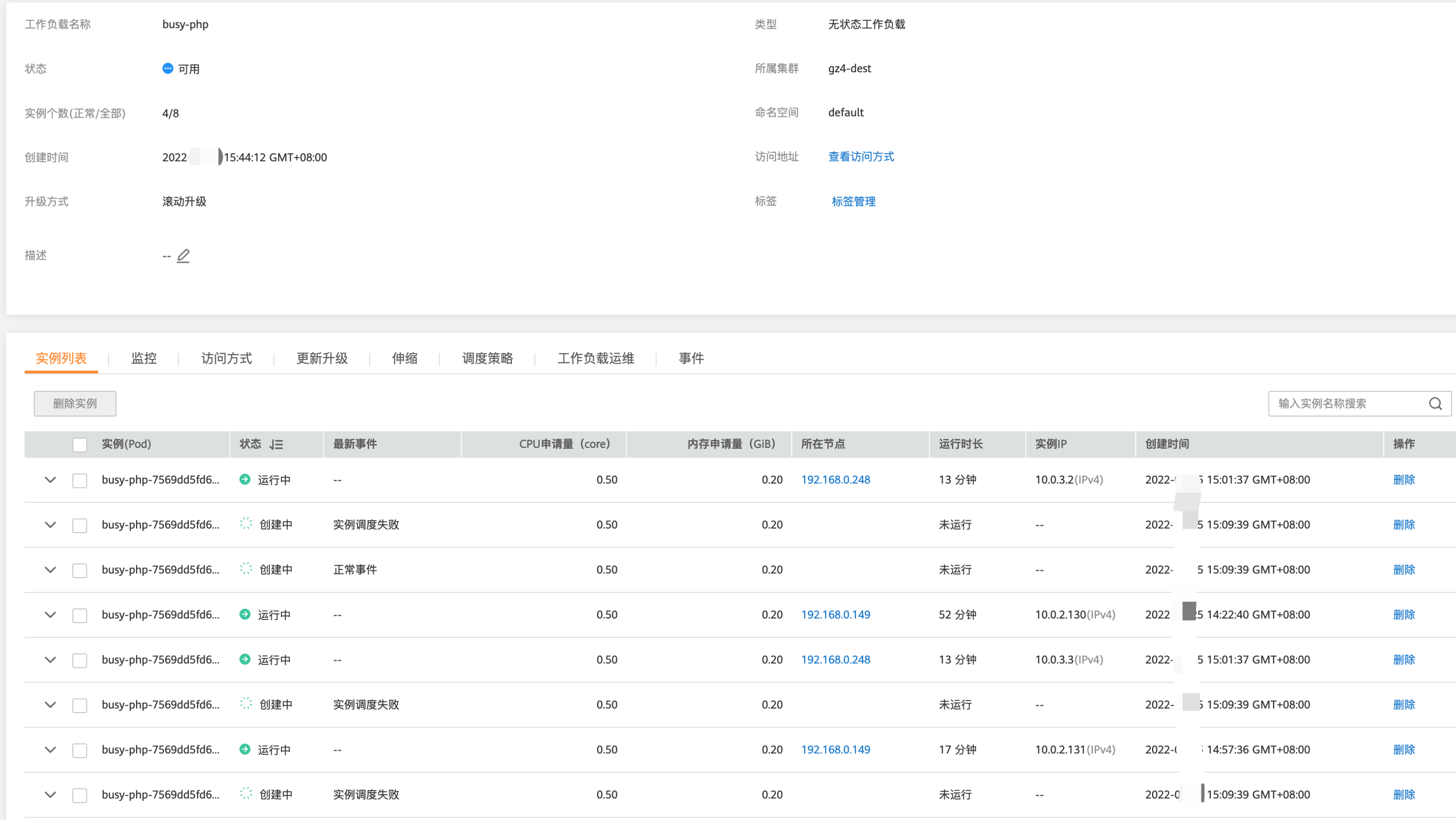 如下圖所示,工作負載的副本數已通過動態擴容達到8,但因為沒有充足的vCPU和內存資源,會被k8s集群標記為“實例調度失敗”。