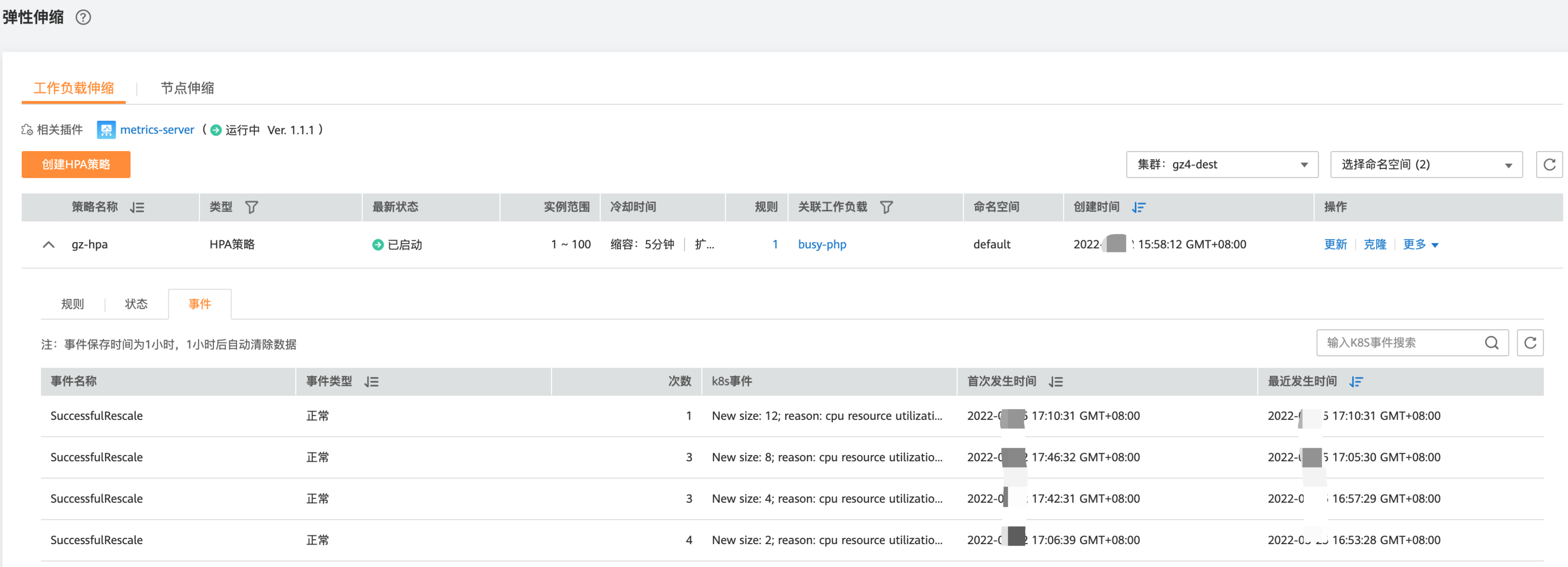 觀察負載和HPA策略的詳情,從事件中可以看到負載的縮容過程和策略生效的時間線,在控制臺中同樣可以看到HPA策略生效歷史。