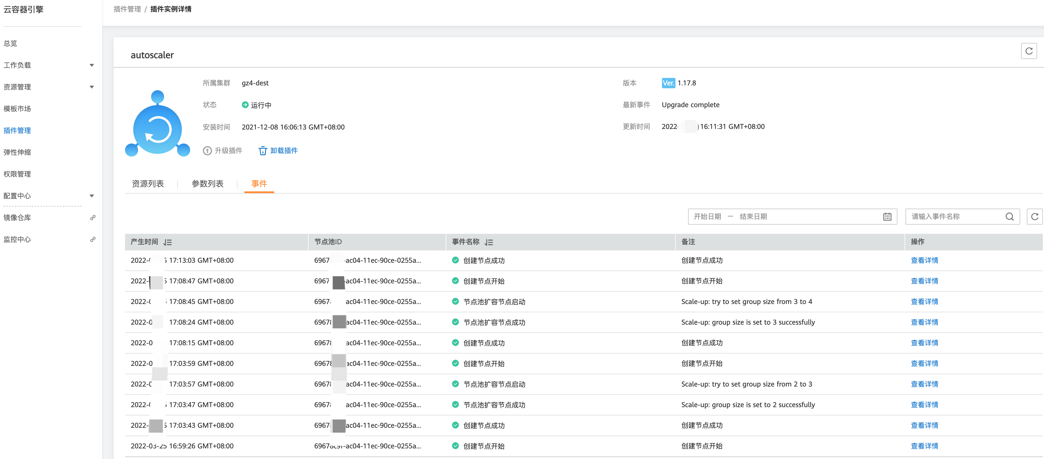 與此同時,查看節點池中的節點數量,發現在剛才工作負載擴容的同時,節點數量也擴容了。在CCE控制臺中可以看到伸縮歷史,節點數量會根據CA及autoscaler策略,通過判斷Pod的Pending狀態進行擴容。