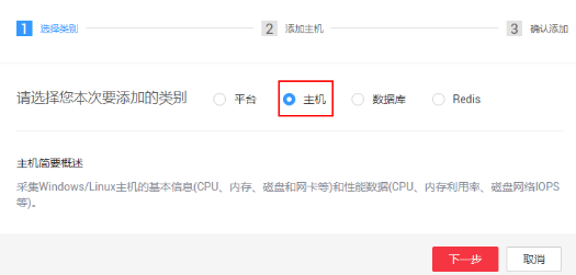 步驟4 在添加類別窗口,選擇需要添加的類別,以添加主機為例,單擊“ 下一步 ”。