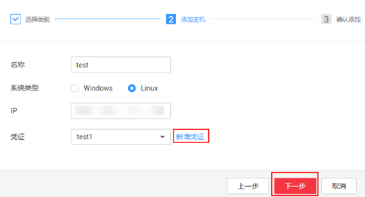 步驟5 填寫相應參數,參數說明參見0。單擊“ 新增憑證 ”,填寫憑證名稱、賬號、密碼,保存憑證后,單擊“ 下一步 ”。