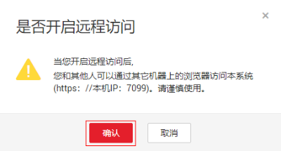 開啟遠程訪問后,您和其他用戶可以通過其它機器上的瀏覽器訪問本系統(https://本機IP:7099),請謹慎開啟。
