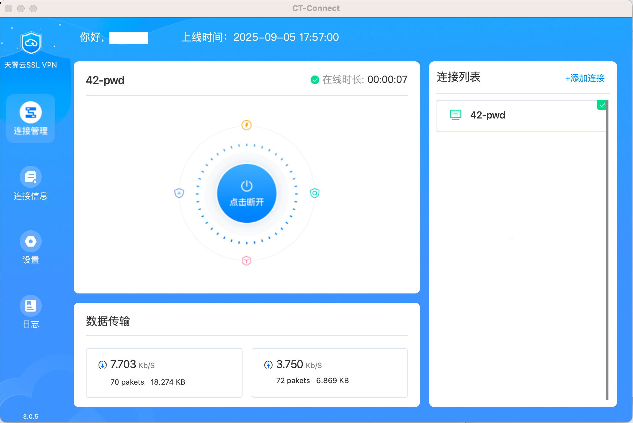 安裝完成,打開CT-CloudConnect客戶端軟件,首次配置客戶端時,點擊“立即新建”,進入新建SSL連接頁面。