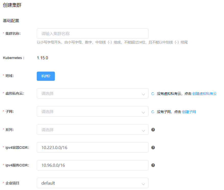 5.輸入集群名稱 cluster1,其余參數保持默認。若未創建虛擬私有云和子網,請優先創建虛擬私有云基礎配置。填寫如下圖:
