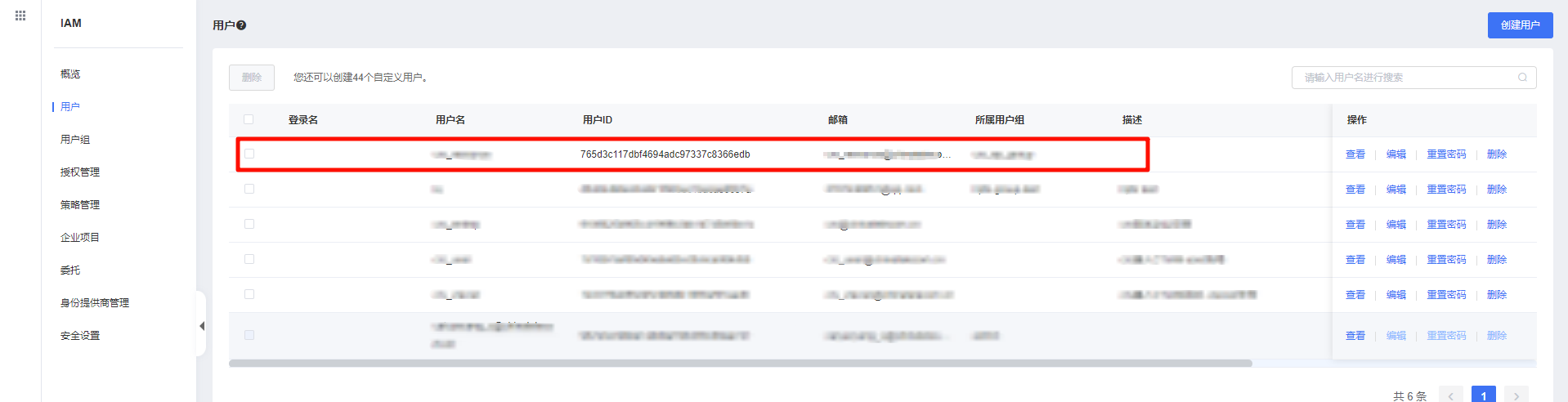 使用主賬戶登錄IAM控制臺,左側導航欄選擇用戶,即可查看到子賬戶用戶ID對應用戶,便可對其進行授權。
