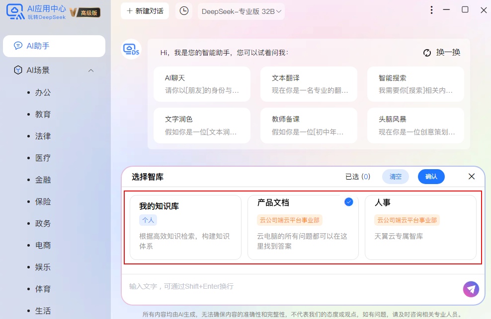 1.打開“AI應用中心”,點擊對話窗口中的“專屬智庫”;