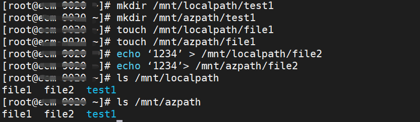 mkdir /mnt/localpath/test1 mkdir /mnt/azpath/test1 touch /mnt/localpath/file1 touch /mnt/azpath/file1 echo ‘1234’ > /mnt/localpath/file2 echo ‘1234’> /mnt/azpath/file2 ls /mnt/localpath ls /mnt/azpath