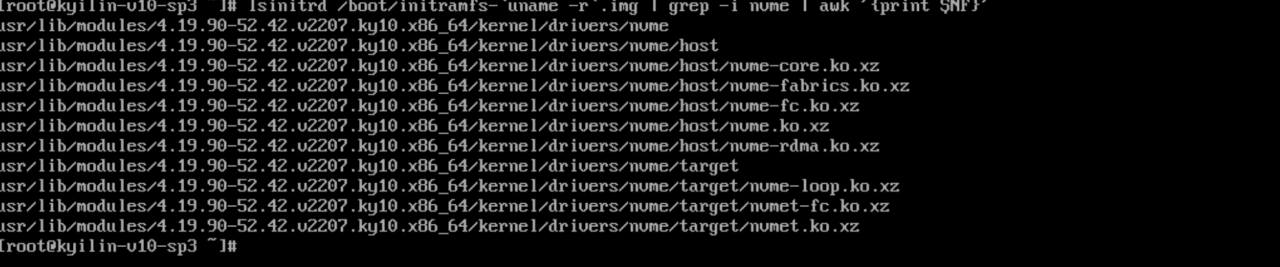 運行以下命令,查看initramfs中是否包含NVMe驅動。