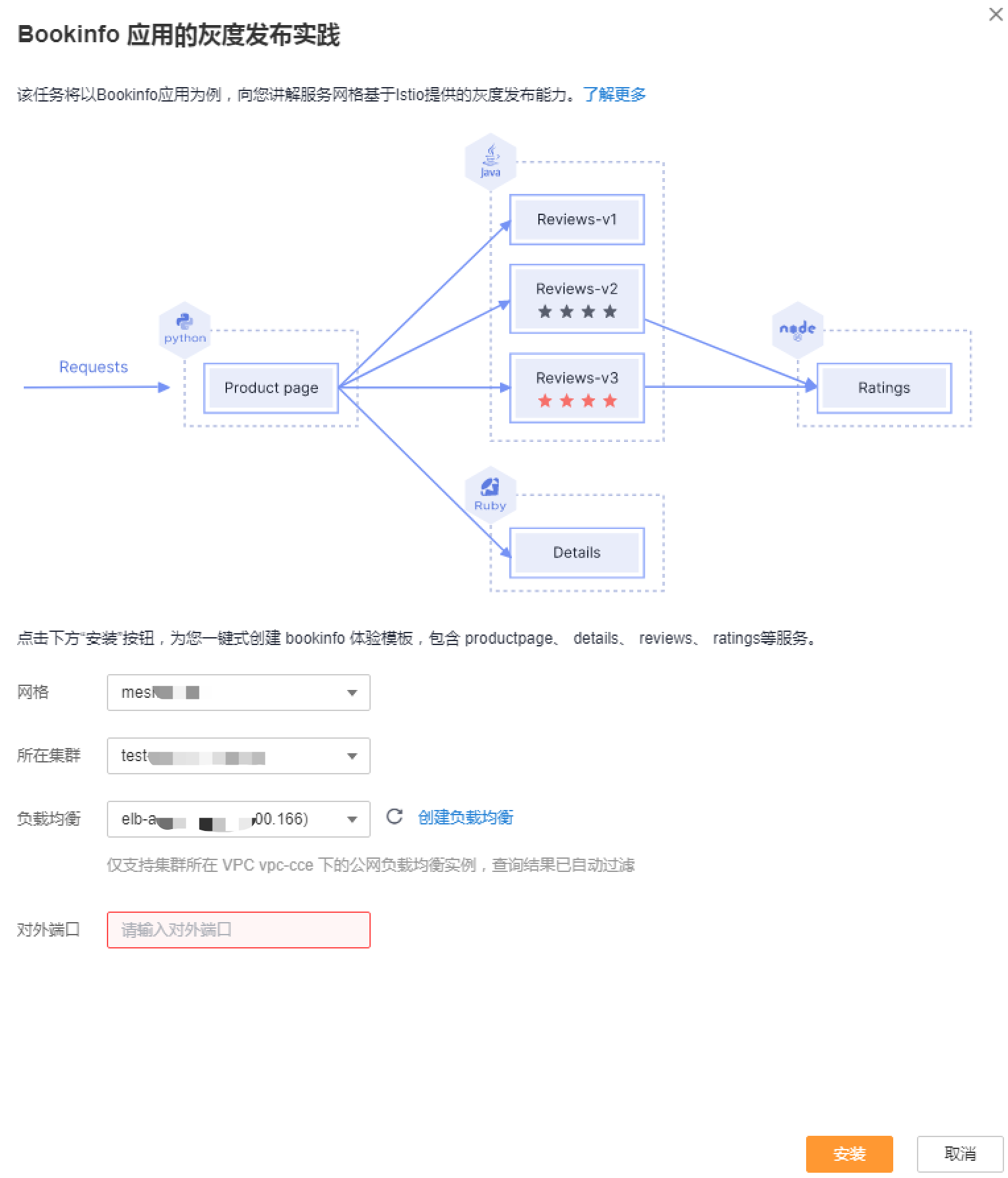 步驟 4 在右側頁面設置Bookinfo應用所在的集群,在“負載均衡”中選擇與所選集群處于同一VPC和子網的負載均衡實例,并設置一個對外端口,單擊“安裝”。