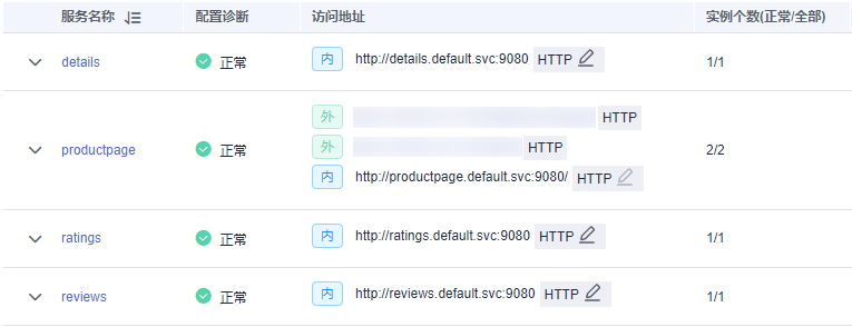 步驟 5 等待Bookinfo應用創建完成。創建完成后單擊網格名稱,進入“服務管理”頁面,配置診斷欄將顯示為“正常”,Bookinfo應用包含productpage、details、reviews、ratings四個服務。