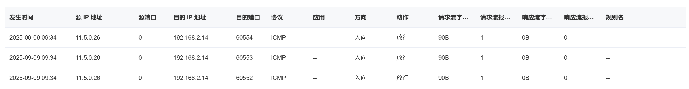 流量日志列表包括發生時間、源IP地址、源端口、目的IP地址、目的端口、協議、應用、方向、動作、請求流字節數、請求流報文數、響應流字節數、響應流報文數、規則名。