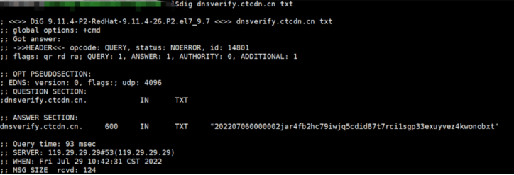 Linux系統解析命令:dig dnsverify.ctcdn.cn txt。