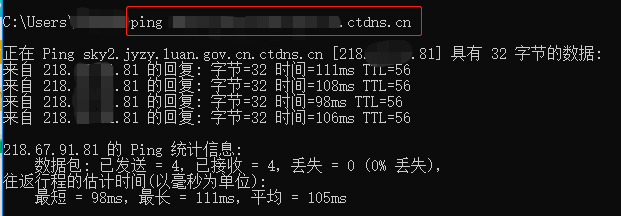 通過ping(Windows)或dig(MAC) CNAME記錄的方式,如 ping *.ctdns.cn獲取該CNAME解析出來的天翼云已為您分配的某個節點IP,即為可測試驗證功能的線上節點IP。