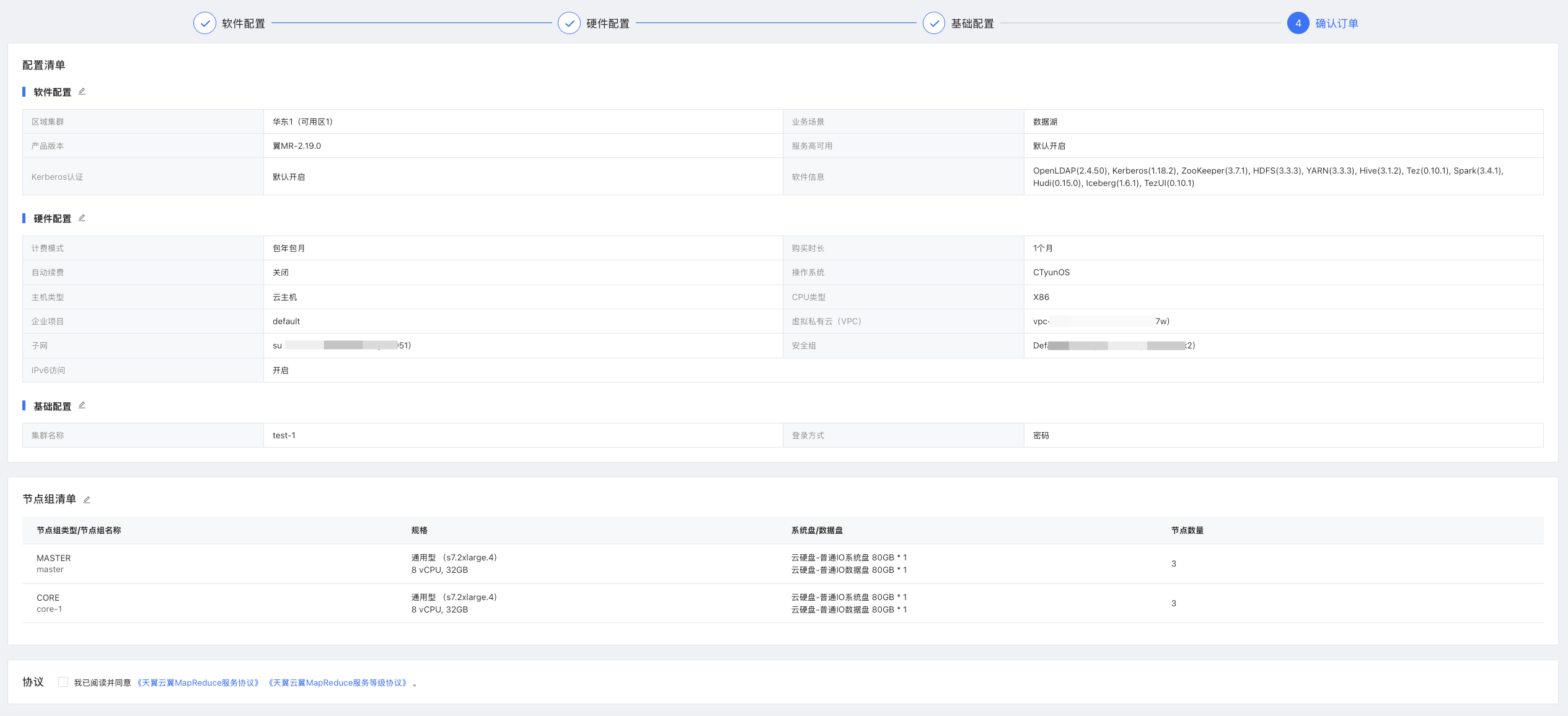 勾選“我已閱讀并同意《天翼云翼MapReduce服務協議》 《天翼云翼MapReduce服務等級協議》”,“立即購買”按鈕變成高亮顯示,進入支付頁面,購買后即可租用當前配置的集群。