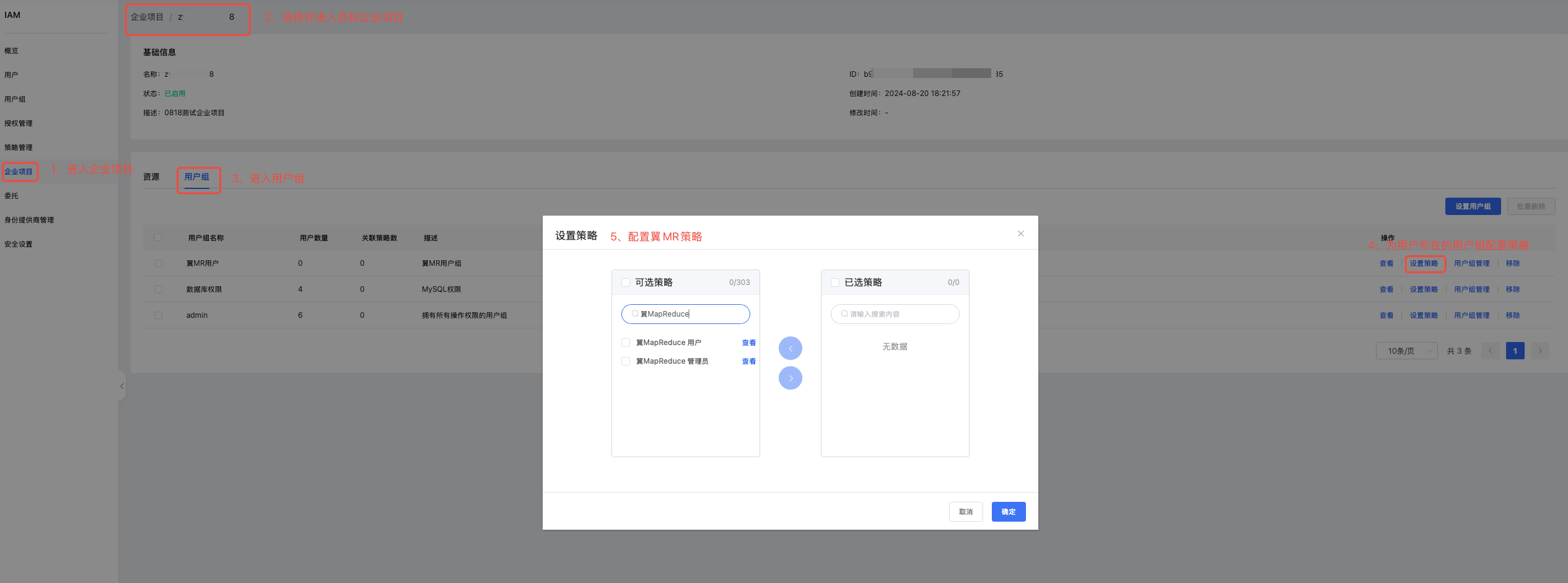 檢查是否具備集群所在企業項目的權限:聯系管理員在“賬號中心”-“統一身份認證服務”功能中,檢查是否有為子用戶配置企業項目權限。管理員可通過用戶組授權或基于企業項目完成授權兩種方式,為子用戶授予在目標企業項目下的翼MR使用權限。管理員授權后,權限預計在1分鐘內生效,子用戶可在翼MR控制臺看到該企業項目下的集群。