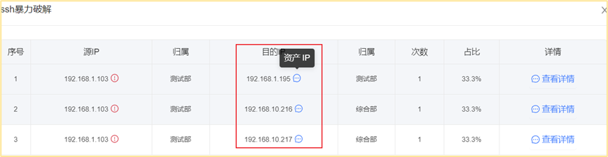 在威脅聚合頁面,用 “事件名稱” 作為聚合條件進行檢索,查找到一條“ssh暴力破解”事件數據,顯示該事件中受影響資產數有3個。