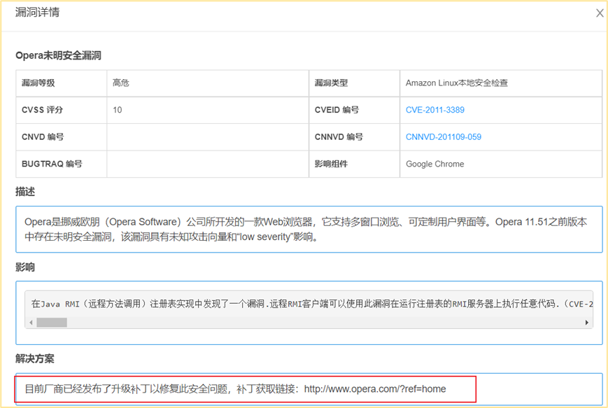 同時也可以查找到資產存在哪些漏洞,通過漏洞列表操作列的“查看詳情”,用戶可以快速找到漏洞修復的解決方案,為后續處置提供依據。
